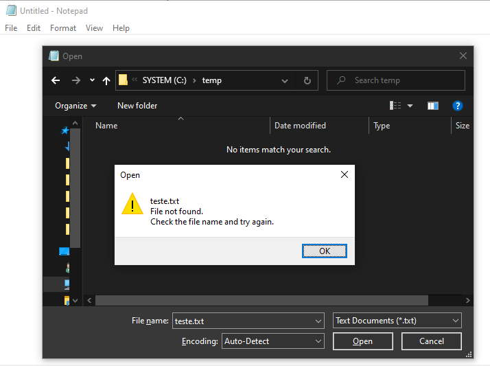 Vamos fazer algo não tão esperto para ver como o bloco de notas reage. Tente abrir um arquivo com um nome inexistente: