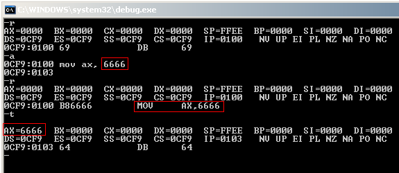 -r AX=0000 BX=0000 CX=0000 DX=0000 SP=FFEE BP=0000 SI=0000 DI=0000 DS=0CF9 ES=0CF9 SS=0CF9 CS=0CF9 IP=0100 NV UP EI PL NZ NA PO NC 0CF9:0100 69 DB 69 -r ss SS 0CF9 :9000 -r sp SP FFEE :ffff -r AX=0000 BX=0000 CX=0000 DX=0000 SP=FFFF BP=0000 SI=0000 DI=0000 DS=0CF9 ES=0CF9 SS=9000 CS=0CF9 IP=0100 NV UP EI PL NZ NA PO NC 0CF9:0100 69 DB 69 -a 0CF9:0100 mov ax, 1234 0CF9:0103 push ax 0CF9:0104 inc ax 0CF9:0105 push ax 0CF9:0106 inc ax 0CF9:0107 push ax 0CF9:0108 -u 0CF9:0100 B83412 MOV AX,1234 0CF9:0103 50 PUSH AX 0CF9:0104 40 INC AX 0CF9:0105 50 PUSH AX 0CF9:0106 40 INC AX 0CF9:0107 50 PUSH AX 0CF9:0108 6C DB 6C ... AX=1234 BX=0000 CX=0000 DX=0000 SP=FFFF BP=0000 SI=0000 DI=0000 DS=0CF9 ES=0CF9 SS=9000 CS=0CF9 IP=0103 NV UP EI PL NZ NA PO NC 0CF9:0103 50 PUSH AX -t AX=1234 BX=0000 CX=0000 DX=0000 SP=FFFD BP=0000 SI=0000 DI=0000 DS=0CF9 ES=0CF9 SS=9000 CS=0CF9 IP=0104 NV UP EI PL NZ NA PO NC 0CF9:0104 40 INC AX -t AX=1235 BX=0000 CX=0000 DX=0000 SP=FFFD BP=0000 SI=0000 DI=0000 DS=0CF9 ES=0CF9 SS=9000 CS=0CF9 IP=0105 NV UP EI PL NZ NA PE NC 0CF9:0105 50 PUSH AX -t AX=1235 BX=0000 CX=0000 DX=0000 SP=FFFB BP=0000 SI=0000 DI=0000 DS=0CF9 ES=0CF9 SS=9000 CS=0CF9 IP=0106 NV UP EI PL NZ NA PE NC 0CF9:0106 40 INC AX -t AX=1236 BX=0000 CX=0000 DX=0000 SP=FFFB BP=0000 SI=0000 DI=0000 DS=0CF9 ES=0CF9 SS=9000 CS=0CF9 IP=0107 NV UP EI PL NZ NA PE NC 0CF9:0107 50 PUSH AX -t AX=1236 BX=0000 CX=0000 DX=0000 SP=FFF9 BP=0000 SI=0000 DI=0000 DS=0CF9 ES=0CF9 SS=9000 CS=0CF9 IP=0108 NV UP EI PL NZ NA PE NC 0CF9:0108 6C DB 6C -d 9000:fff9 9000:FFF0 36 12 35 12 34 12 00 6.5.4.. -