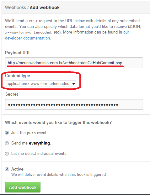 Lembre-se de colocar seu código PHP em um servidor visível na web. Lembre-se também de usar o método de envio urlencoded do payload para simplificar seu tratamento. Para simplificar ainda mais o processo, coloque qualquer coisa no segredo (não validaremos neste post, mas #ficadica de segurança se você não quer que outros acessem seu PHP inadvertidamente).