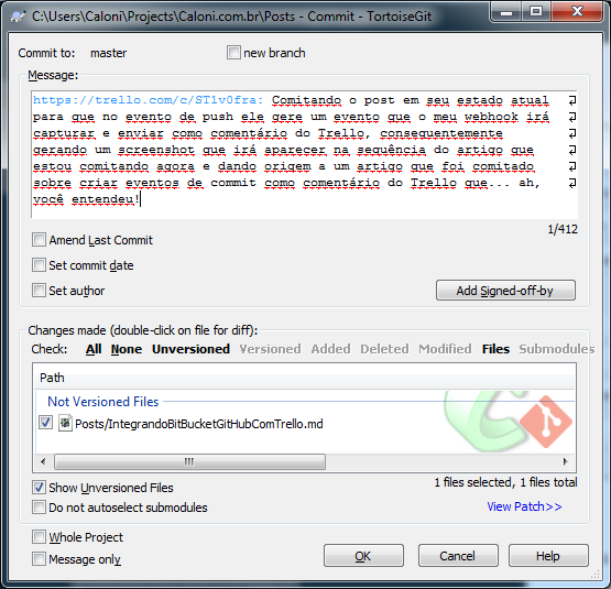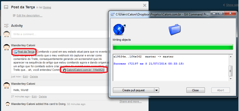 Caloni, 2014-07-22 computer blogEu nem acredito que estou escrevendo sobre desenvolvimento web, mas como foi algo que me fez dedicar algumas horas do meu fim-de-semana, e não encontrei facilmente uma solução já feita, acredito que pode ser útil para mais alguém que usa Trello e GitHub (ou BitBucket).