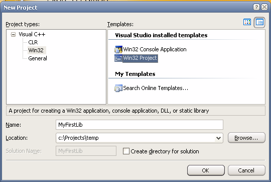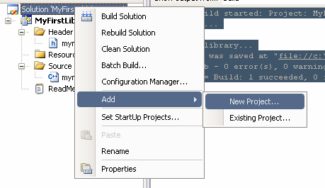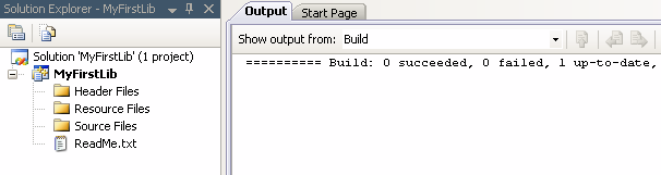 ------ Build started: Project: MyFirstLib, Configuration: Debug Win32 ------ Compiling... mymath.c Creating library... Build log was saved at "file://c:\Projects\temp\MyFirstLib\Debug\BuildLog.htm" MyFirstLib - 0 error(s), 0 warning(s) ========== Build: 1 succeeded, 0 failed, 0 up-to-date, 0 skipped ==========