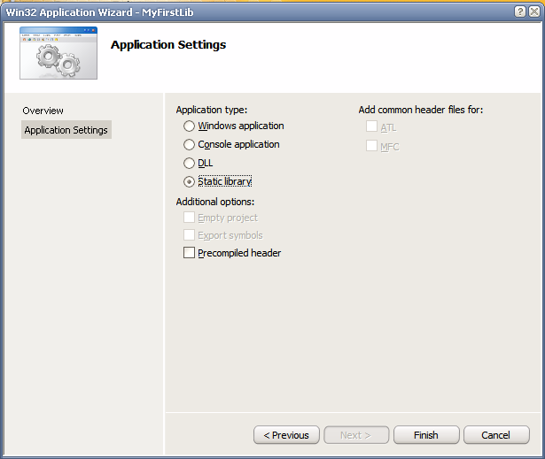 A seguir, escolhemos nas opções do assistente criar uma "Static library", e desmarcamos a opção de "Precompiled header" para evitar má sorte logo no primeiro projeto de LIB (má sorte significa horas procurando erros incríveis que você só irá fazer desaparecer se recompilar tudo com o uso do famigerado "Rebuild All"; espero que isso dê certo para você, para mim não tem funcionado).