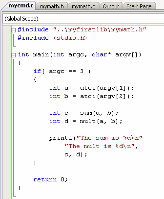 ------ Build started: Project: MyFirstCmd, Configuration: Debug Win32 ------ Compiling... mycmd.c Linking... mycmd.obj : error LNK2019: unresolved external symbol mult referenced in function main mycmd.obj : error LNK2019: unresolved external symbol sum referenced in function main c:\Projects\temp\MyFirstLib\Debug\MyFirstCmd.exe : fatal error LNK1120: 2 unresolved externals Build log was saved at "file://c:\Projects\temp\MyFirstCmd\Debug\BuildLog.htm" MyFirstCmd - 3 error(s), 0 warning(s) ========== Build: 0 succeeded, 1 failed, 1 up-to-date, 0 skipped ==========