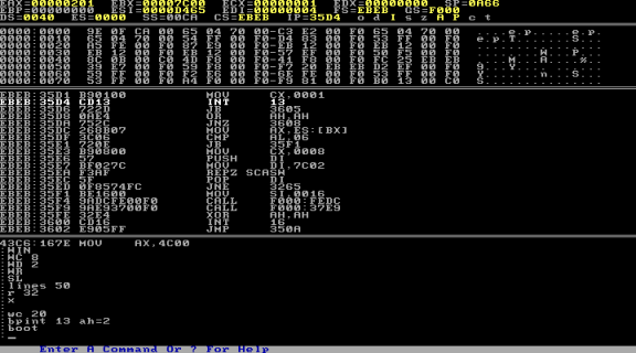 A partir dessa leitura se usa o comando p ret do depurador, que é mais ou menos o step out do SoftIce 32. Ou seja, ele avança a execução até a função retornar. No caso do SoftIce 16 ele irá avançar até o próximo ret/iret. Por isso que também precisamos executar a próxima instrução (o próprio ret) para cair onde queremos. É nesse ponto que o "nosso" código começa a executar e onde conseguimos colocar breakpoints "de verdade", ou seja, escrevendo no parte do código que deve ser interrompida a chamada da interrupção de breakpoint (int 3). Lembre-se que não é isso o que é feito para parar no código da BIOS, uma vez que esta reside em memória de somente leitura (pelo menos durante a execução).