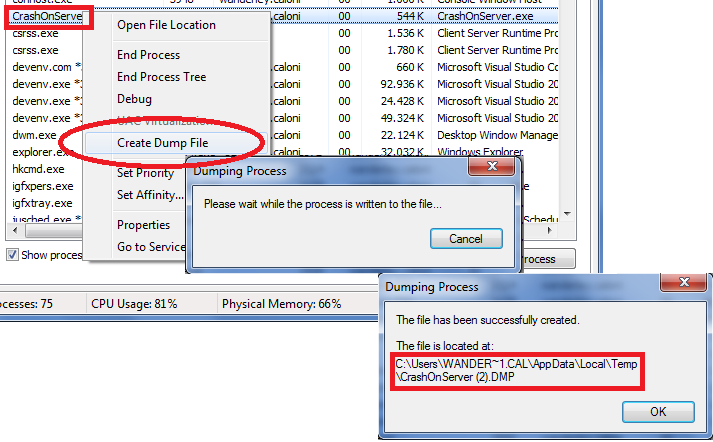 Para a primeira opção, basta abrir o Gerenciador de Tarefas, localizar o processo e gerar o dump através do menu de contexto.