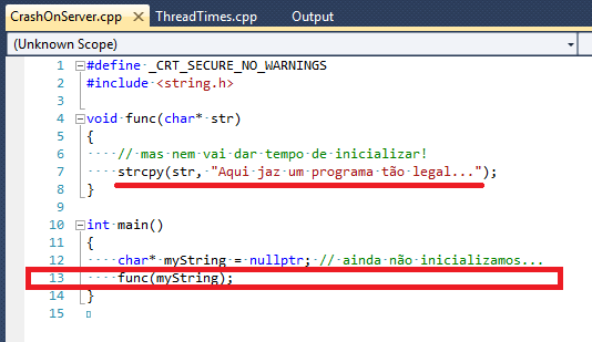 Nosso depurador favorito acusa uma pilha que contém a função WerpReportFault (Web Error Report, mas qualquer outra função com Exception no meio seria uma candidata). E, nessa mesma thread, a última linha nossa conhecida está no arquivo crashonserver.cpp:13. Isso nos revela o seguinte: