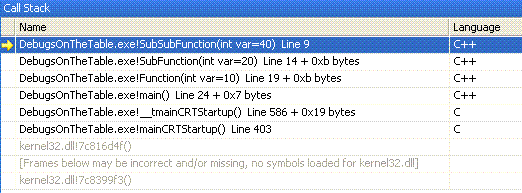 Seguindo as janelas e comandos úteis de debug, a pilha de chamadas ou stack trace mostra a pilha da thread atual sendo depurada. Com ela você consegue ver o nome da função que chamou a função que chamou a função que chamou... até a função inicial (por exemplo, o nosso conhecido main, a primeira função de um programa "normal" em C/C++).