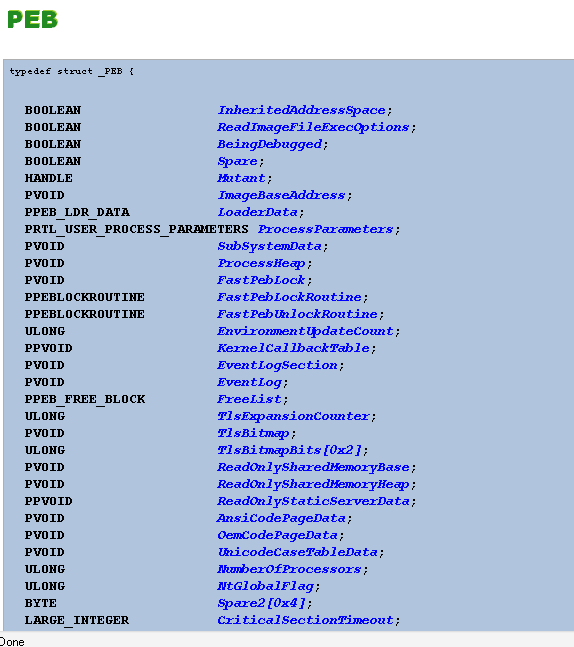 O comando !peb traz inúmeras informações sobre essa estrutura. Mas talvez estivéssemos interessados em coisas não mostradas por esse comando, mas que existem na estrutura.