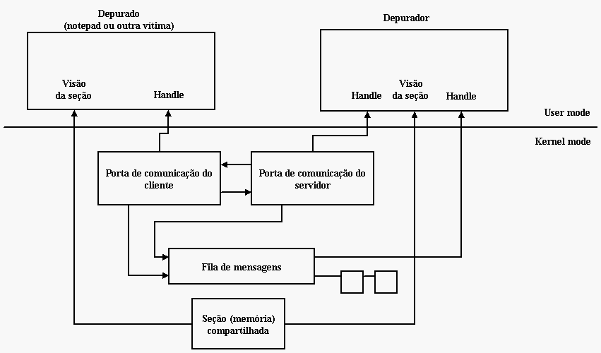 2007-08-23 blog projects computer Quando um depurador inicia um processo para ser depurado ou, o caso abordado por este artigo, se conecta em um processo já iniciado, as comunicações entre esses dois processos é feita através de um recurso interno do Windows chamado de LPC (Local Procedure Call). O sistema cria uma "porta mágica" de comunicação específica para a depuração e os eventos trafegam por meio dela.
