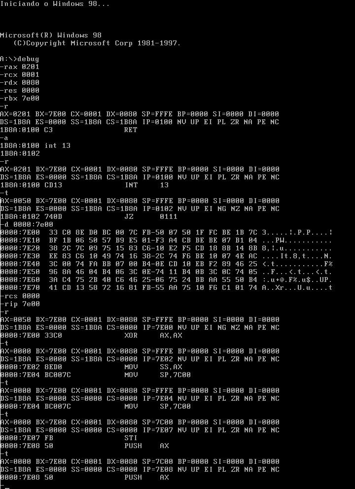 2008-03-24 computer blog Dando continuidade a um artigo bem antigo sobre [depuração da BIOS usando SoftIce], como já vimos, podemos igualmente depurar a MBR após a chamada da INT13. Porém, devo atentar para o fato que, em algumas VMs, e sob determinadas condições do tempo e quantidade de ectoplasma na atmosfera, é possível que a máquina trave após o hot boot iniciado pelo depurador. Isso provavelmente tem cura usando o espaço de endereçamento alto da memória com a ajuda de aplicativos como LH e UMB.