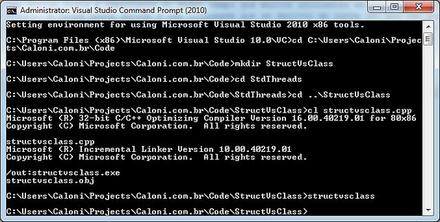 2007-11-01 computer blog Desde uns tempos para cá o Visual Studio tem se tornado uma das ferramentas mais pesadas de desenvolvimento já criadas (Update 2026-02-20: e desde que a Microsoft transformou o Windows em um sistema de ad sense a coisa só piorou). Como se não bastasse, a compilação de pequenos trechos de código é algo desnecessariamente complicado no ambiente (Update 2026-02-20: mas isso melhorou consideravelmente). Por esse motivo estou ganhando o costume de usar a linha de comando para esse tipo de tarefa. Afinal de contas, na maioria das vezes a única coisa que eu preciso fazer é abrir o atalho "Visual Studio Command Prompt" e digitar uma linha: cl meu-codigo-fonte-do-coracao.cpp.