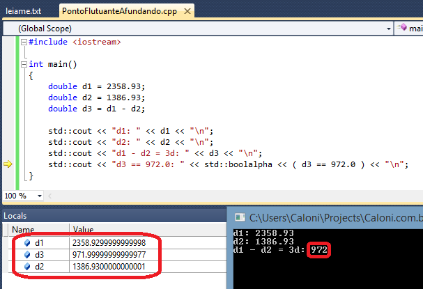 2013-11-07 computer blog Quando armazenamos valores monetários em doubles seus cálculos conseguem manter a precisão e na maioria das vezes o ajuste de precisão funciona. Porém, encontrei alguns casos onde a subtração de dois valores fazia "perder" um centavo (ou comparações exatas) justamente pela limitação da precisão do ponto flutuante. Nesse exemplo os valores são 2.358,93 - 1.386,93, que em uma conta de padaria (mas correta) dá 972,00 (até a Calc do Windows (2026-03-28 link quebrado) e o Excel funcionam), mas pelo Visual Studio 2010 chega perto, mas erra o alvo: