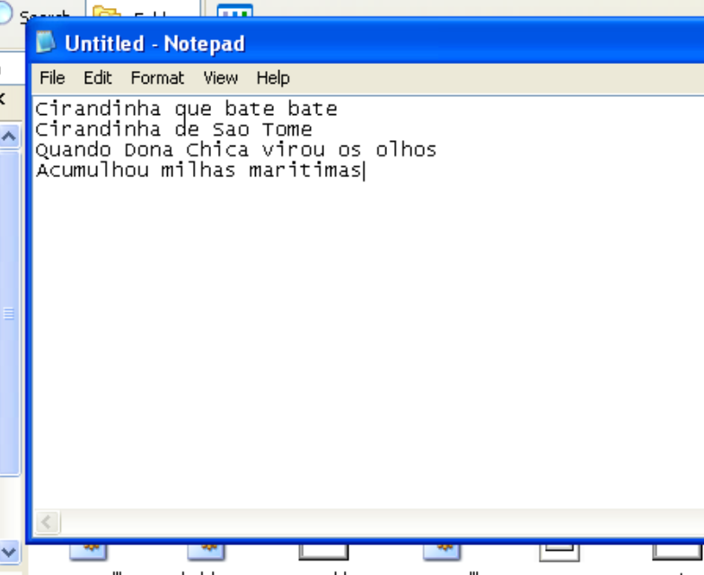 Vamos testar aqui o log da nossa cobaia de plantão, o amigo Notepad (ou Bloco de Notas), exibindo um texto que demonstra com perfeição uma das minhas características mais bizarras: confundir expressões e frases prontas.