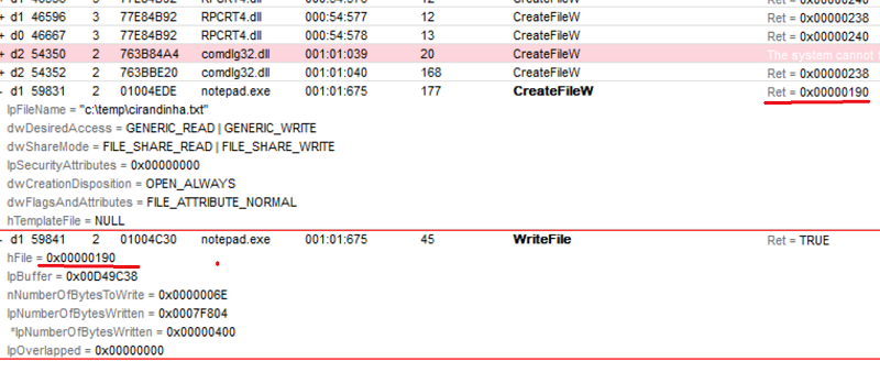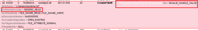Note, por exemplo, que houve uma falha antes na abertura do mesmo arquivo, mas isso porque houve uma tentativa de abrir um arquivo que já existe (abertura com direito de apenas leitura). Essa chamada foi feita pela DLL do diálogo comum de abertura/salvamento de arquivo do Windows (comdlg32.dll), e não pelo notepad.exe.