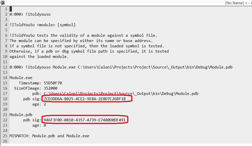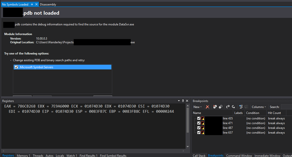 ntdll!LdrpDoDebuggerBreak+0x2b: 77e13bad cc int 3 0:000> .symfix No downstream store given, using C:\Tools\DbgTools(x86)\sym 0:000> !sym noisy noisy mode - symbol prompts on 0:000> .reload /f Module.exe SYMSRV: C:\Tools\DbgTools(x86)\sym\Module.pdb\hash\Module.pdb not found SYMSRV: http://msdl.microsoft.com/download/symbols/Module.pdb/hash/Module.pdb not found DBGHELP: C:\Users\Caloni\Projects\Project\Source\_Output\bin\Debug\Module.pdb - mismatched pdb DBGHELP: Couldn't load mismatched pdb for C:\Users\Caloni\Projects\Project\Source\_Output\bin\Debug\Module.exe DBGHELP: Module - no symbols loaded