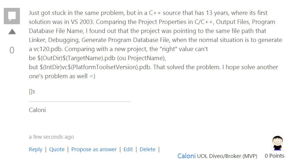Just got stuck in the same problem, but in a C++ source that has 13 years, where its first solution was in VS 2003. Comparing the Project Properties in C/C++, Output Files, Program Database File Name, I found out that the project was pointing to the same file path that Linker, Debugging, Generate Program Database File, when the normal situation is to generate a vc120.pdb. Comparing with a new project, the "right" value can't be $(OutDir)$(TargetName).pdb (ou ProjectName), but $(IntDir)vc$(PlatformToolsetVersion).pdb. That solved the problem. I hope solve another one's problem as well =)