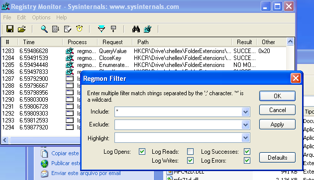 Para iniciar, filtramos os resultados do RegMon para apenas capturar escritas no registro, não importando se falharam ou deram resultado.