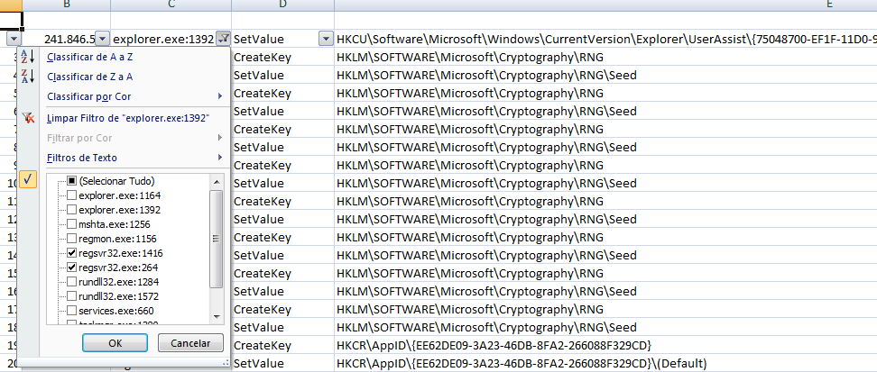 Tendo a saída do RegMon exportada para formato texto, abrimos no Excel e filtramos o conteúdo pelo nome do processo. Note que existem duas instâncias de regsvr32 para usar, pois não sabemos em qual delas é danificado o registro.