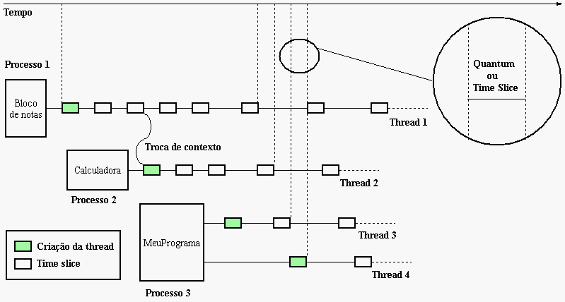 Porém, em uma plataforma com apenas um processador, como é natural supor, apenas uma thread roda de cada vez. Para dar a impressão de rodar ao mesmo tempo o tempo de execução das threads é dividido entre elas, de forma que aparentemente todas elas rodam ao mesmo tempo. Essa unidade de divisão do tempo de execução é conhecido como quantum, ou Time Slice, e é caracterizado como o tempo em que uma thread fica rodando até que outra thread tome o seu lugar, ou seja, ocorra uma troca de contexto (switch context). Quando uma thread é criada ela ganha seu primeiro time slice (se não iniciar suspensa) e divide o tempo de processamento com outras threads que executam no mesmo processador.