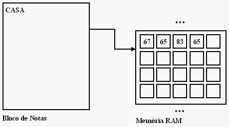 Através da nossa já conhecida tabela ASCII! Na verdade, números são armazenados na memória, mas por representarem as letras 'C', 'A', 'S' e 'A', são traduzidos de volta para o formato texto pelo Bloco de Notas, que conhece o que guardou na memória.