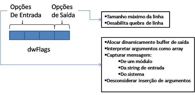 No caso do FormatMessage, a variável dwFlags se divide em dois para especificar dois grupos de opções distintos. A parte maior contém as opções armazenadas tradicionalmente como um mapa de bits, enquanto o byte menos significativo define como será tratada a saída final, com respeito às novas linhas e qual será a largura máxima de uma linha na saída.