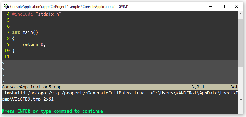 Pois é. Tirando essa facilidade, as coisas no Vim para msbuild rodam particularmente bem. Basta alterarmos o makeprg da seguinte maneira: