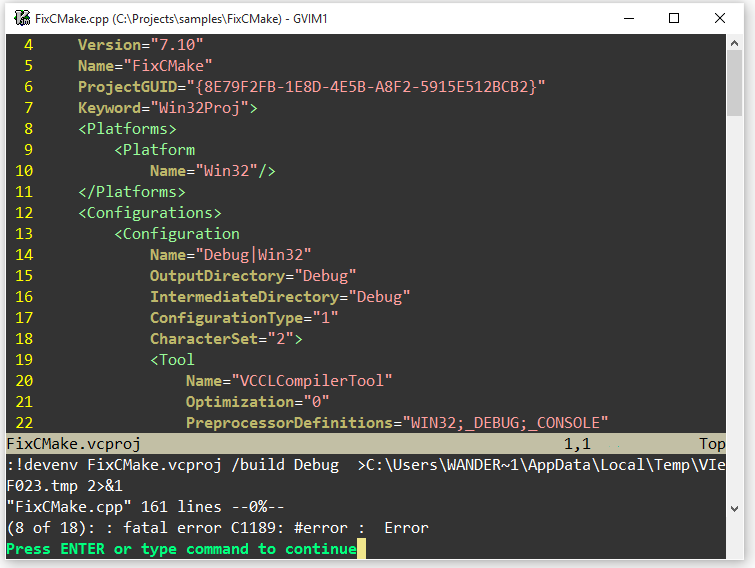 C:\Projects\samples\FixCMake>devenv.com FixCMake.sln /build Debug