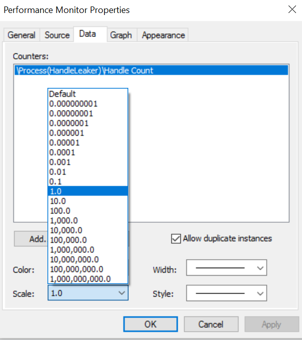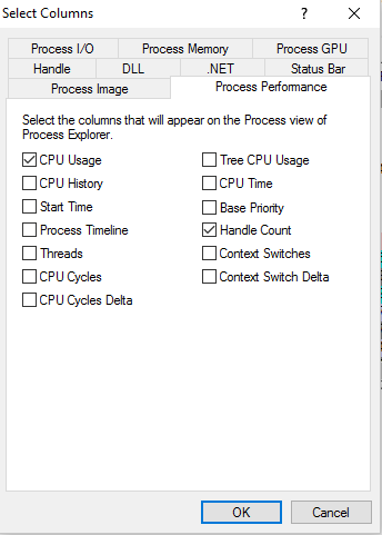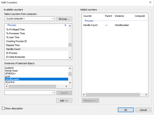 Existem incontáveis contadores no Perfmon. Para o que precisamos vamos em Process e escolhemos o contador de Handles: