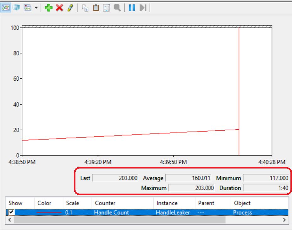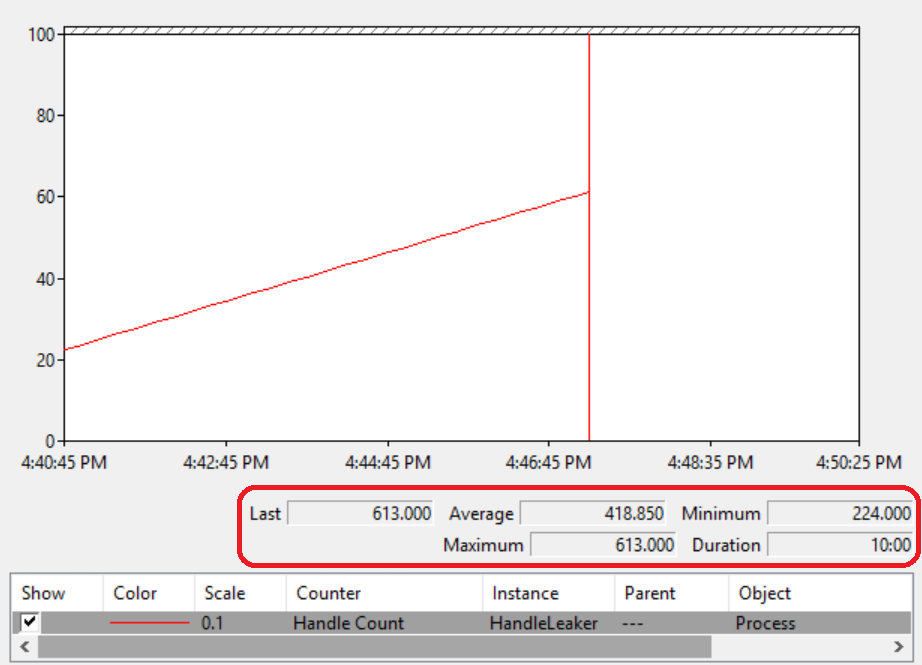 O HandleLeaker é apenas um exemplo de aplicação que realiza o leak de um handle por segundo. Ele tenta (e consegue) abrir um handle para seu próprio processo, e deixa o handle aberto (programas em Win32 API não são muito bons em RAII).