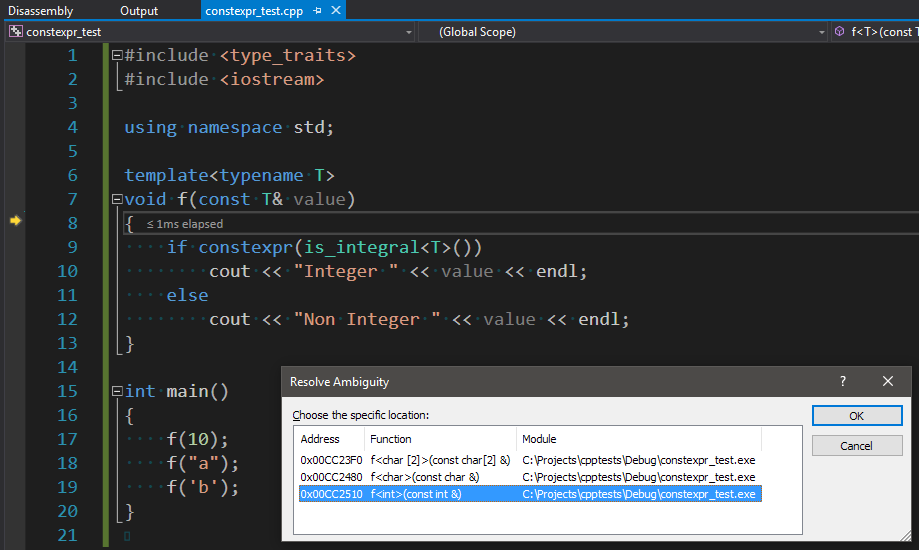 A otimização no if através do uso da palavra-chave __constexpr__ possibilita a criação de diferentes instâncias da chamada que não contém o if, mas um dos dois branches dependendo do tipo ser integral ou não.