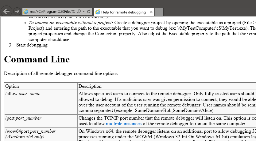 No caso do msvsmon, se executado com /? (padrão entre programas Windows) ele abre um pequeno help com a ajuda necessária para executar os parâmetros corretos: