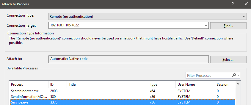 Agora ache o IP da máquina-alvo e vá em Debug, Attach to Process (Ctrl+Alt+P) no Visual Studio, modo remoto e digite o IP.