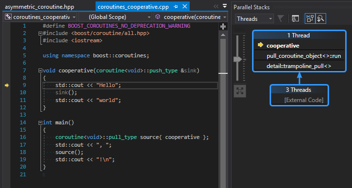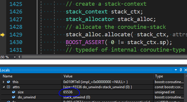 typedef pull_coroutine_object<push_coroutine, coroutine_fn, stack_allocator> object_t; void * sp = static_cast<char*>(stack_ctx.sp) - sizeof( object_t); impl_ = new (sp) object_t(boost::forward<coroutine_fn>(fn), attrs, detail::preallocated(sp, size, stack_ctx), stack_alloc);
