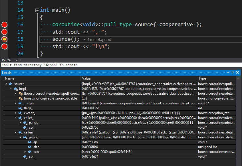 0:000> ~kvn # ChildEBP RetAddr Args to Child 00 00b707c4 00f39668 00b708c8 075d31e5 00b70a08 coroutines_cooperative!cooperative+0xa0 (FPO: [Non-Fpo]) (CONV: cdecl) [c:\projects\caloni\static\samples\coroutines_cooperative\coroutines_cooperative.cpp @ 19] 01 00b70910 00f18b5b cdcdcdcd cdcdcdcd 00f01fd2 coroutines_cooperative!boost::coroutines::detail::pull_coroutine_object<boost::coroutines::push_coroutine<void>,void,void (__cdecl*)(boost::coroutines::push_coroutine<void> &),boost::coroutines::basic_standard_stack_allocator<boost::coroutines::stack_traits> >::run+0xf8 (FPO: [Non-Fpo]) (CONV: thiscall) [c:\libs\vcpkg\installed\x86-windows\include\boost\coroutine\detail\pull_coroutine_object.hpp @ 281] *** ERROR: Symbol file could not be found. Defaulted to export symbols for C:\Projects\caloni\static\samples\coroutines_cooperative\Debug\boost_context-vc141-mt-gd-x32-1_67.dll - 02 00b70a08 54261075 0075f4f0 0075f528 ffffffff coroutines_cooperative!boost::coroutines::detail::trampoline_pull<boost::coroutines::detail::pull_coroutine_object<boost::coroutines::push_coroutine<void>,void,void (__cdecl*)(boost::coroutines::push_coroutine<void> &),boost::coroutines::basic_standard_stack_allocator<boost::coroutines::stack_traits> > >+0x9b (FPO: [Non-Fpo]) (CONV: cdecl) [c:\libs\vcpkg\installed\x86-windows\include\boost\coroutine\detail\trampoline_pull.hpp @ 42] WARNING: Stack unwind information not available. Following frames may be wrong. 03 00b70a14 ffffffff 77c49ec1 cdcdcdcd cdcdcdcd boost_context_vc141_mt_gd_x32_1_67!make_fcontext+0x75 ... 0a 00b70a30 00000000 00000000 00000000 00b70a48 coroutines_cooperative!boost::coroutines::detail::pull_coroutine_object<boost::coroutines::push_coroutine<void>,void,void (__cdecl*)(boost::coroutines::push_coroutine<void> &),boost::coroutines::basic_standard_stack_allocator<boost::coroutines::stack_traits> >::`vftable' .detach