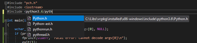 c:\Libs\vcpkg>dir /s /b installed\x86-windows\*python*.lib c:\Libs\vcpkg\installed\x86-windows\debug\lib\boost_python36-vc140-mt-gd.lib c:\Libs\vcpkg\installed\x86-windows\debug\lib\python36_d.lib c:\Libs\vcpkg\installed\x86-windows\lib\boost_python36-vc140-mt.lib c:\Libs\vcpkg\installed\x86-windows\lib\python36.lib c:\Libs\vcpkg>mv c:\Libs\vcpkg\installed\x86-windows\debug\lib\python36_d.lib \Temp 1>------ Rebuild All started: Project: ConsoleApplication1, Configuration: Debug Win32 ------ 1>pch.cpp 1>ConsoleApplication1.cpp [triplet]: https://github.com/Microsoft/vcpkg/blob/master/docs/users/triplets.md [CMake]: https://cmake.org/cmake/help/v3.11/manual/cmake-toolchains.7.html [exemplo do help]: https://docs.python.org/3/extending/embedding.html 1>LINK : fatal error LNK1104: cannot open file 'python36_d.lib' 1>Done building project "ConsoleApplication1.vcxproj" -- FAILED. ========== Rebuild All: 0 succeeded, 1 failed, 0 skipped ==========