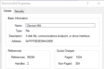 Esses dois sockets são herdáveis por default (implementação da função socket) e são representados pelos handles listados no Process Explorer como já visto, pelo nome "\Device\Afd". O contador de handles é aumentado a partir da criação do processo-filho e esses dois handles aparecem em ambos os processos.