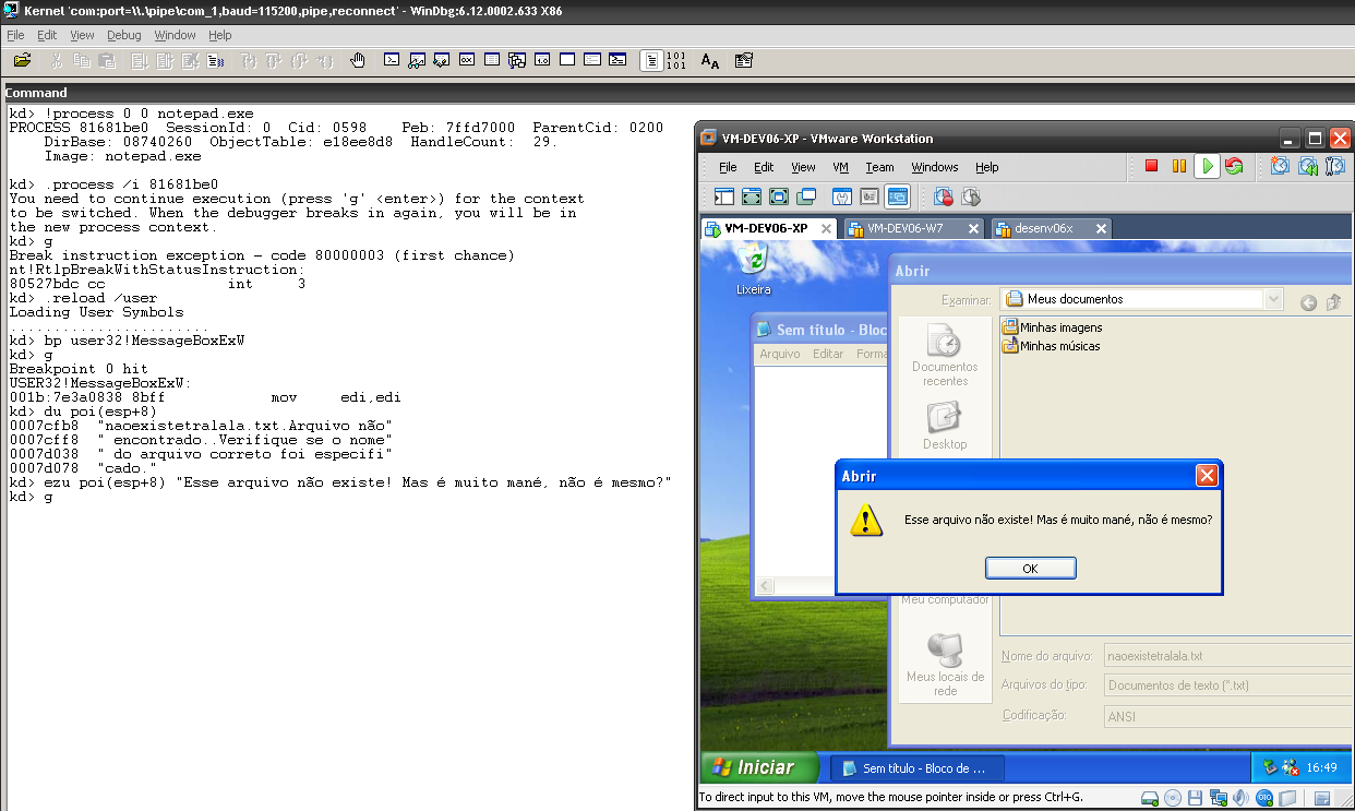 2007-06-20 windbg debugging computer 2025-10-05: Hoje o Logger está desatualizado e não recomendo mais seu uso. Há ferramentas melhores, como API Monitor, além de ser possível você mesmo desenvolver com a lib Detours. O WinDbg é uma ferramenta obrigatória em uma das minhas mais divertidas tarefas aqui na Open: engenharia reversa de cavalos de tróia. Não tenho o código-fonte desses programas, não posso executá-los em minha própria máquina e não consigo fazer tudo que preciso usando apenas o depurador integrado do Visual Studio (como remontar o assembly do programa, por exemplo). Tudo isso faz do WinDbg a alternativa perfeita (senão uma das únicas). É um depurador que permite ser usado tanto através de janelas quanto através de comandos, o que permite um aprendizado em doses homeopáticas: comece com as janelas e aos poucos ganhe o controle total. Conseqüentemente cada dia aprendo um comando novo ou um novo uso para um comando que já conheço. introducao_ao_debugging_tools_for_windows